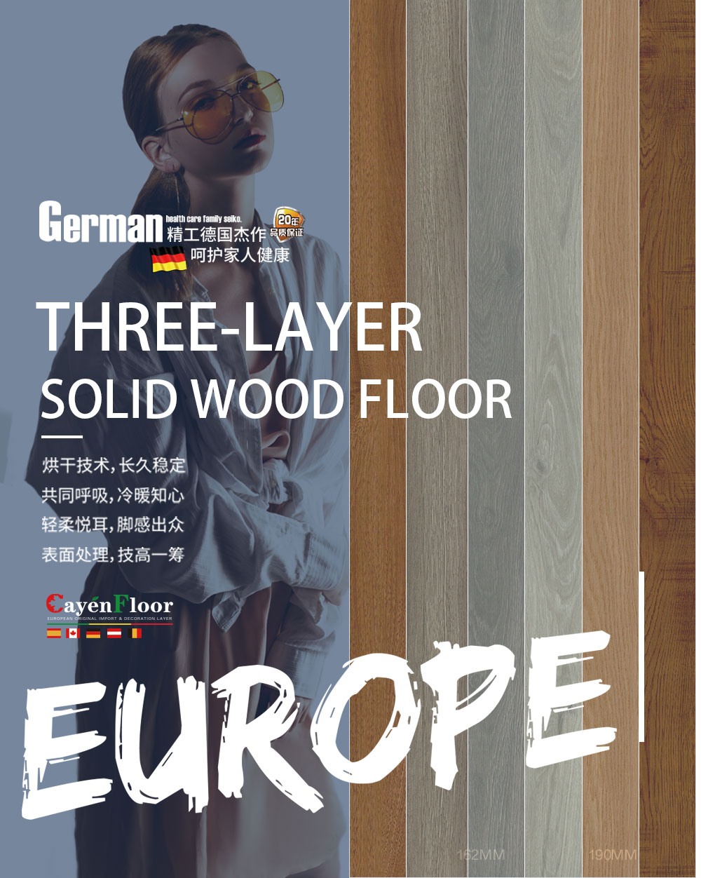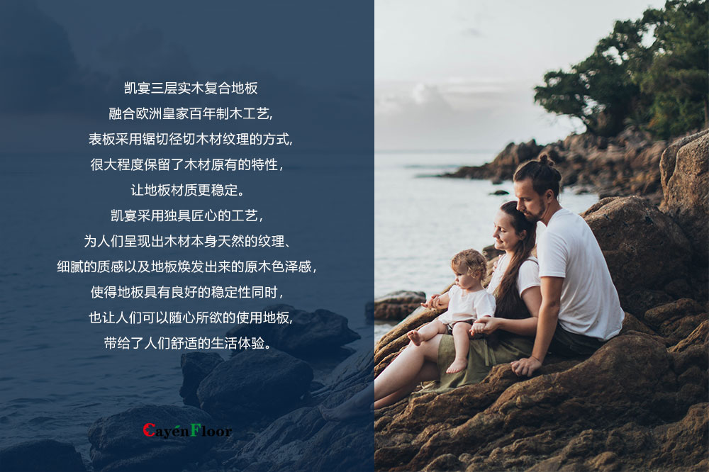 产品属性:凯宴三层实木复合地板 融合欧洲皇家百年制木工艺, 表板采用锯切径切木材纹理的方式, 很大程度保留了木材原有的特性。